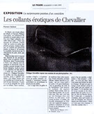 En tenant l'objet du désir hors d'atteinte par effet de couture Chevallier fait repousser le fantasme comme du chiendent. Le vu et la caché s’homogénéisent loin de toute confrontation et pour une unité secrète au sein même de l’hymen du Nylon et de la peau. Créer n’est pas plus séparer, défaire qu’ouvrir et exhiber. L’union, la fusion chair et textile deviennent l’inverse de la « con-fusion ». Se cerne un mystère existentiel à travers un art qui seul est susceptible de lui donner formes et volumes. Nous sommes ravis devant cet objet que l'artiste ravi. Nous sommes au milieu d'un limon d'étoiles filantes et en territoire aussi interdit que suave. Le rouge du désir prend des couleurs chair mais par délégation. L'enveloppe fait le jeu ce qu'elle cache - ou presque pas. N'est-ce pas toujours comme ça que l'art, le "vrai" commence ? Que donc reprocher à de telles prises ? Ce ne sont pas des clichés mais des épreuves. Pour une fois on les espère en rêvant de passer par leurs mailles. Ne boudons plus notre désir.