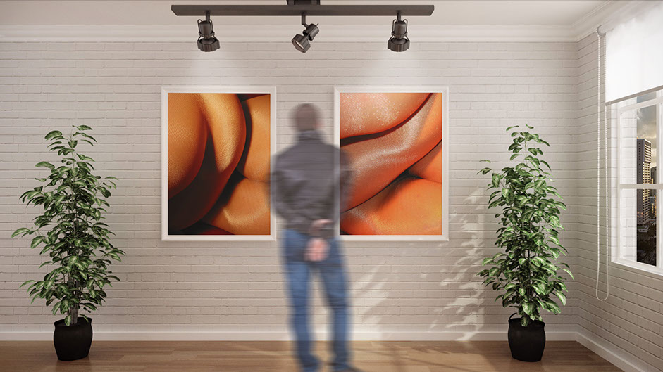 Des formes abstraites émergent des décors ambigus. Tout ce mélange dans un curieux processus de création, très intime et ludique. Très érotique aussi surtout. Le regard est intéressant et original. Le collant donne une unité de mesure, une universalité dans le traitement de l’objet qui devient irréel, entre réalité et fantasme.